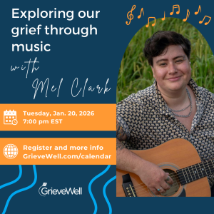 Exploring our grief through music with Mel Clark Mel Clark (they/them) is a board certified Music Therapist and ... 20 Jan 7:00 pm - 8:00 pm